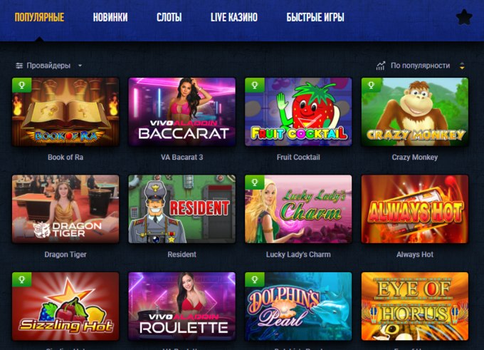 Ассортимент онлайн казино насчитывает более 800 различных игровых автоматов. Пользователи могут выбрать слоты, однорукие бандиты, игры с живыми дилерами, лотереи, видеослоты. Список регулярно обновляется, добавляются новинки. Наиболее популярные игры с высокой отдачей попадают на главную страницу. Топ 5 автоматов на деньги:
